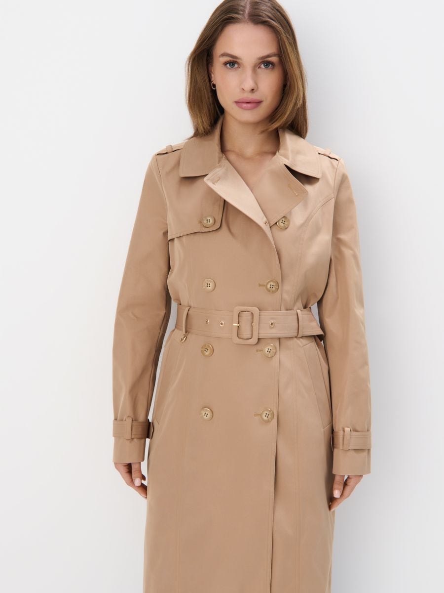 Beżowy trencz z paskiem